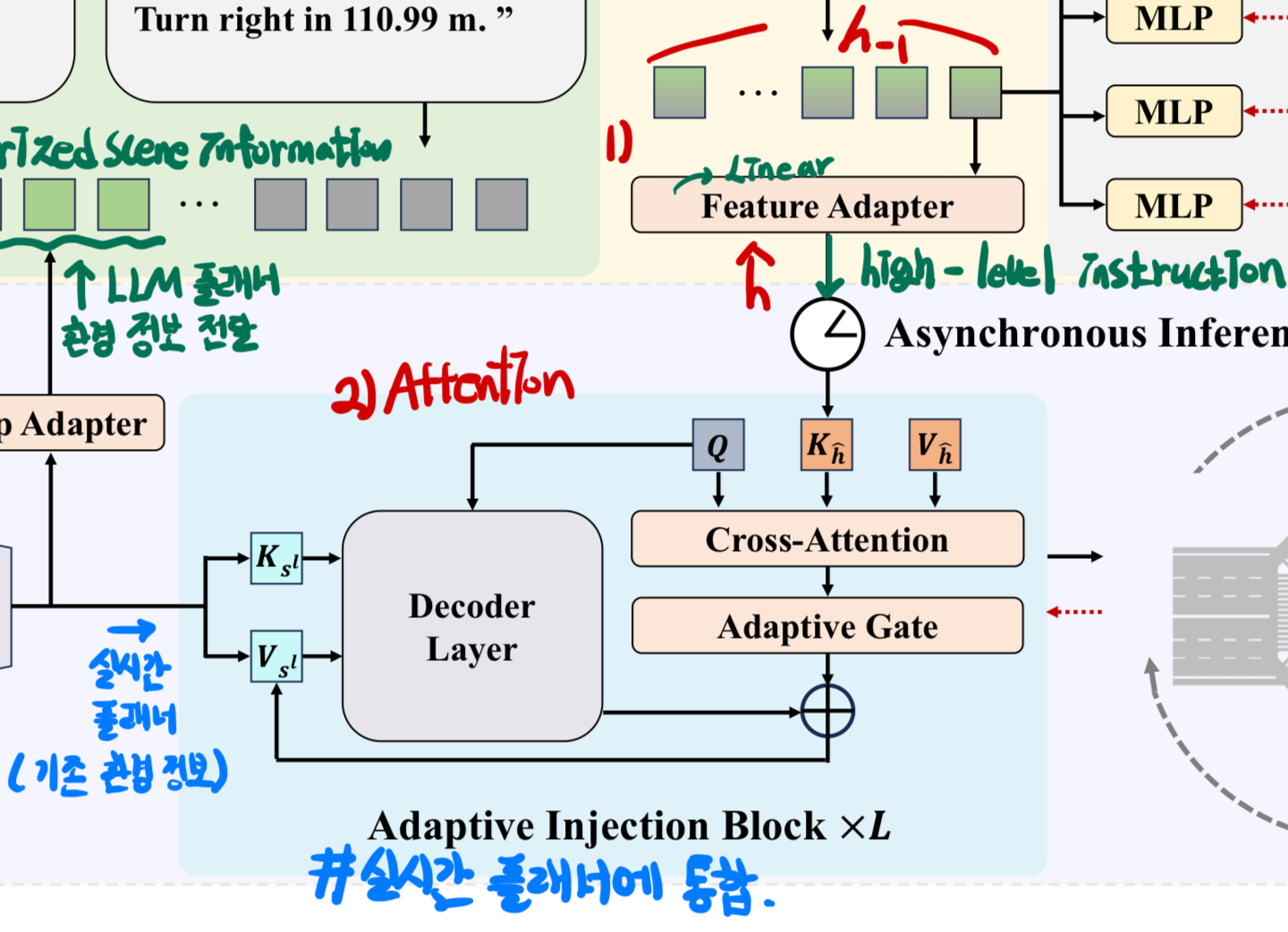 이러한 문제를 해결하기 위해 LLM과 실시간 플래너의 추론 빈도를 효과적으로 분리하여, LLM이 매 프레임마다 처리할 필요가 없도록 한다. 사실상 이게 논문의 핵심이다. 비동기 간격 동안, 이전에 도출된 고수준 지침 feature가 계속해서 실시간 플래너의 예측 과정을 안내하며, 이는 추론 효율을 크게 향상시키고 LLM이 초래하는 연산 비용을 줄인다.