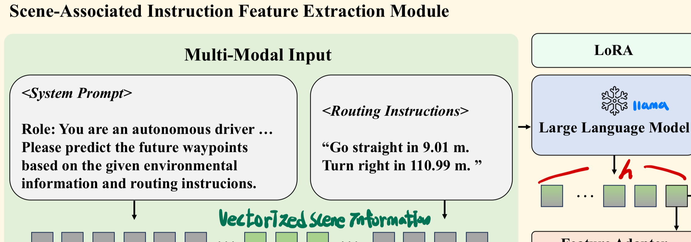 벡터화된 장면 정보 vectorized scene information와 일련의 경로 지시 routing instructions를 정렬하여 LLM의 지시 해석 및 복잡한 시나리오 이해 능력을 최대한 활용하도록 한다. high-level instruction features를 추출한다.