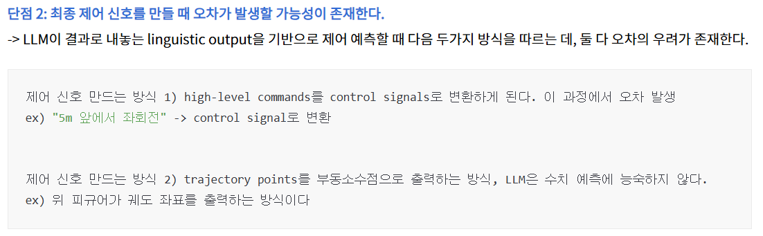 비디오, 센서 데이터 등과 결합하여 보다 정확한 의사 결정을 수행 | LLM의 최종 output으로 나오는 언어를 control signals로 변환하는 데 한계가 존재 |