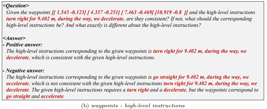 waypoints, high-level instructions, 그리고 control 간의 관계를 LLM이 더 잘 이해할 수 있도록 설계됨. 확장성을 고려하여 rule-based 접근 방식을 사용하여 생성되었다. waypoints, high-level instructions, 그리고 control 간 변환 과정에 초점을 둔 6가지 유형의 질문을 포함한다.