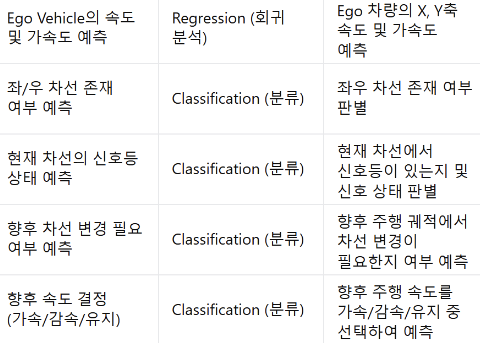 - ego velocity/acceleration (L1), 속도 결정 (CE), 신호등 상태 (CE), 인접 차선 존재 여부 (BCE), 차선 변경 여부 (BCE)