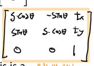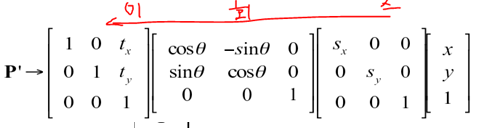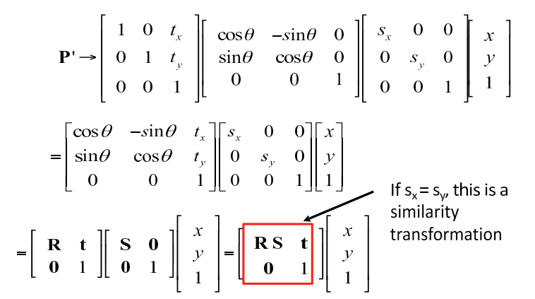 이를 한 번에 표현하면 다음과 같은 하나의 행렬로 표현할 수 있다. 연산의 순서가 바뀌면 결과가 달라질 수 있으므로 연산 순서는 스케일링 -> 회전 -> 이동임을 기억하고 있자. # 스 회 이