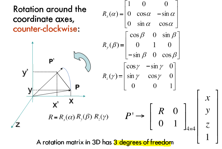 이게 좀 다르다. 왜 회전 행렬인데 자유도가 3일까? Pitch((X)), yaw((Y)), roll((Z)) 기준의 각도 3개를 모두 생각해야하기 때문이다.