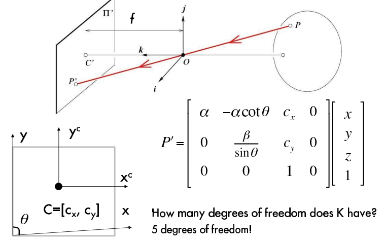 일반적으로 다음과 같은 파라미터를 생략할 수 있다. Θ = 90도: 센서 플레인과 옵티컬 축이 직각으로 잘 맞물려있는 경우 α = β: x와 y 방향 픽셀 크기가 같다고 가정 즉 정사각형 픽셀 -> 3개의 파라미터만 남긴다.