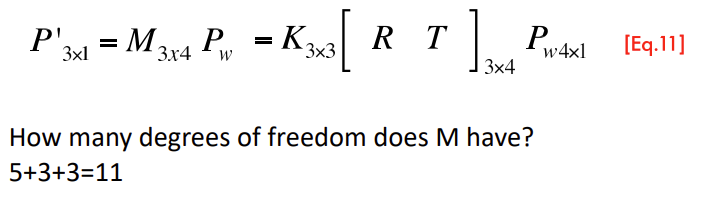 총 자유도는 11이다. K에 5개, 그리고 회전과 이동에 관련하여 R에 3개, T에 3개가 있었다.