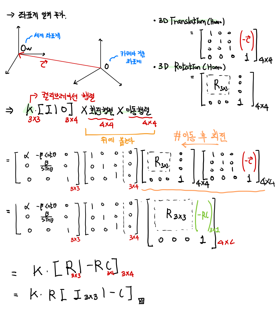 K[I|0]는 고정이다! 즉 3D -> 2D 과정은 K[I|0]이 고정이다. 좌표계를 바꾸고 싶다면 연산들을 추가하는 것이다. # K[I|O] 뒤 추가